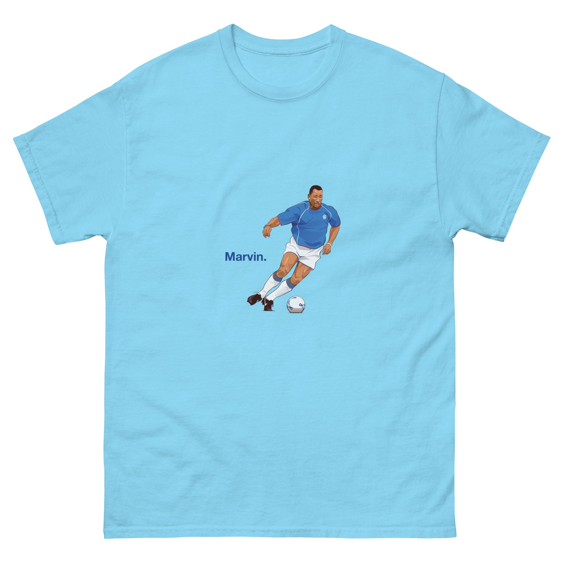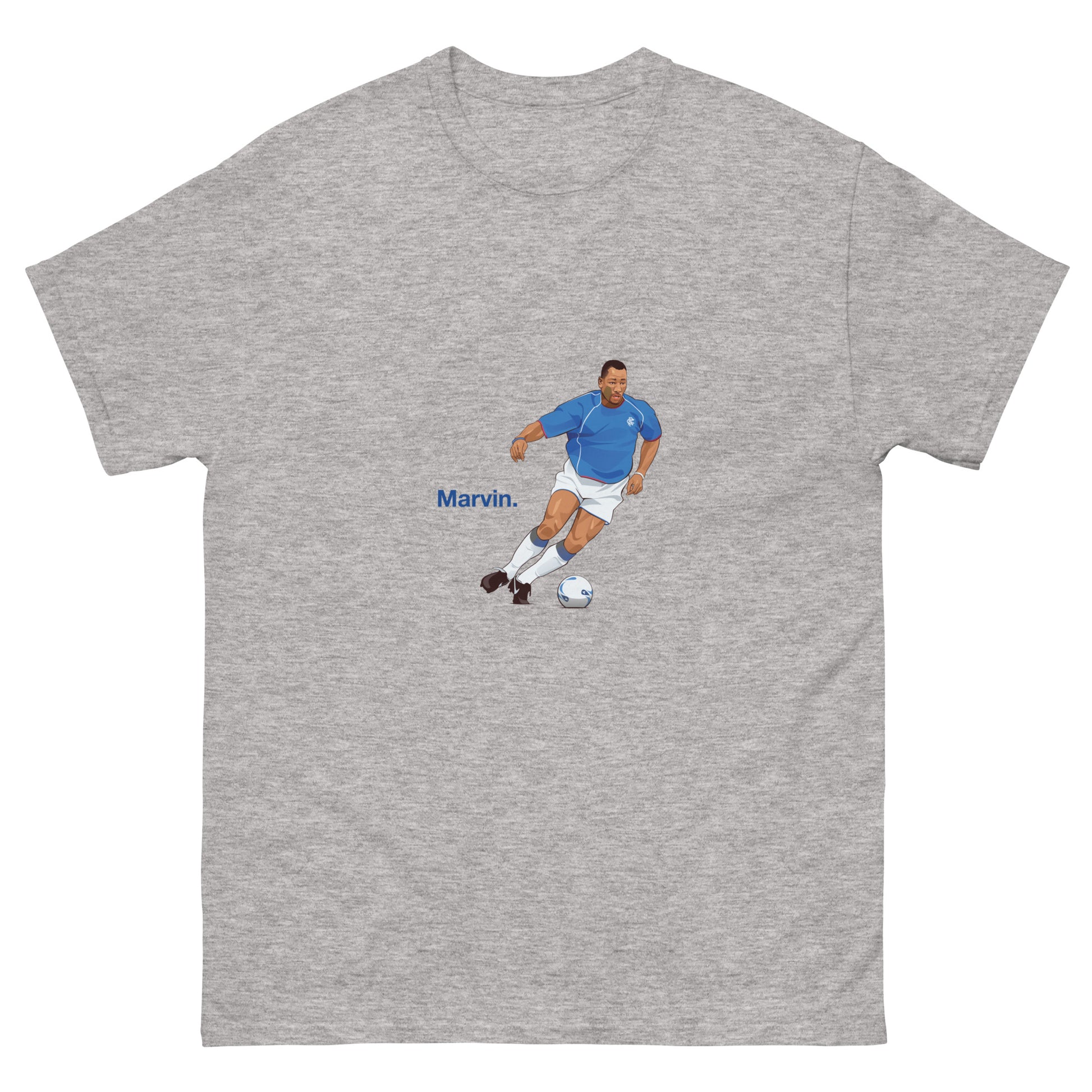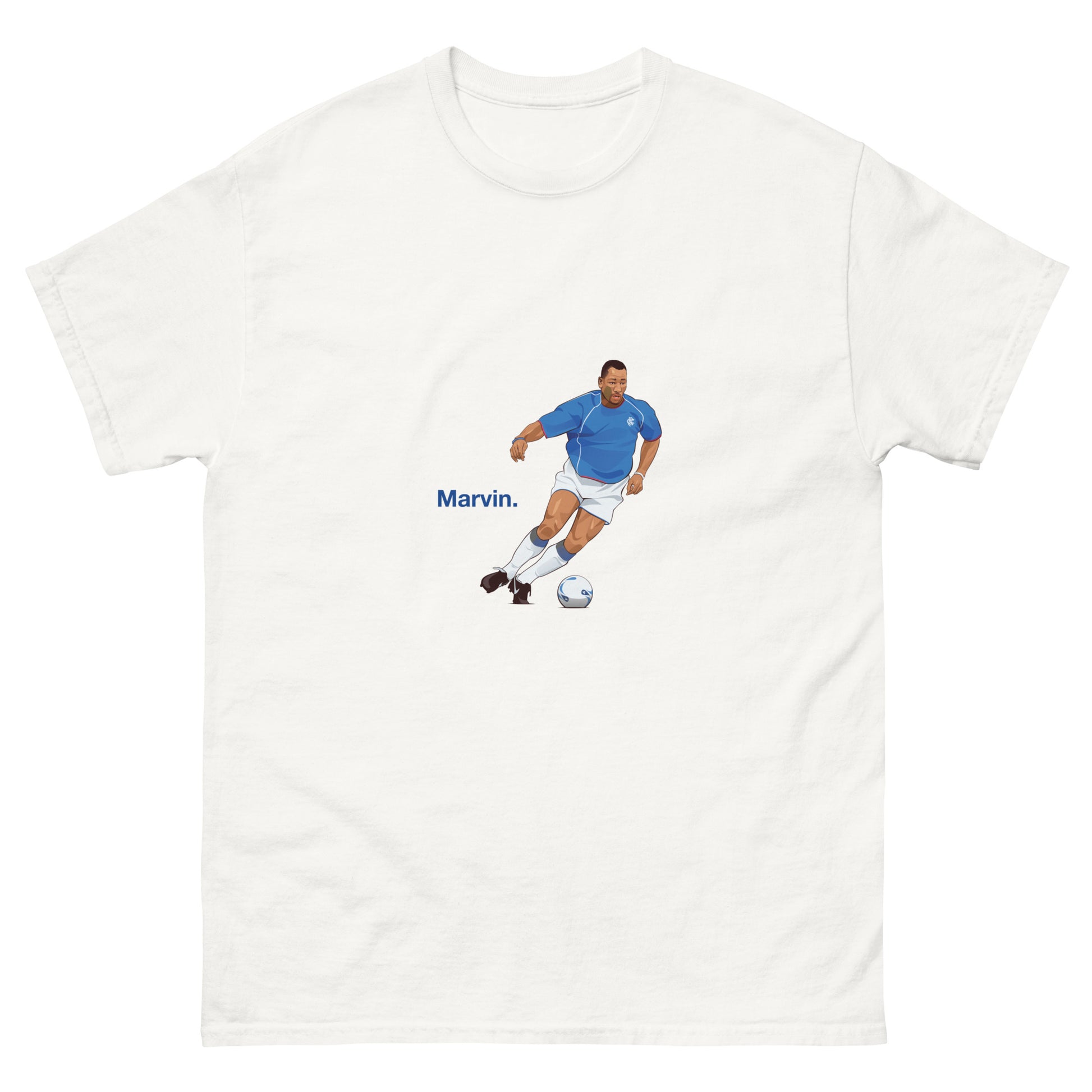 Marvin has a special place in the hearts of Rangers fans, and vice versa. This guy was the definition of a "unit". He truly believed a torn cruciate wouldn't stop him playing! As well as his unique self-belief he was voted Player's Player Of The Year by his Rangers colleagues which says it all. Honour big Marv with this fantastic t-shirt.
